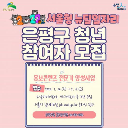 은평구(구청장 김미경)는 올해 ‘홍보콘텐츠 전문가 양성사업’에 참여할 청년을 오는 26일부터 2월4일까지 모집한다고 밝혔다.