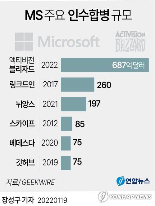 (뉴욕=연합뉴스) 강건택 특파원 = 마이크로소프트(MS)가 18일(현지시간) 미국의 대형 게임업체 액티비전 블리자드(이하 블리자드)를 687억달러(약 81조9천억원)에 인수한다고 밝혔다.