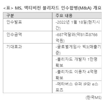 MS가 블리자드 인수 절차를 완료하면, MS는 텐센트와 소니에 이어 글로벌 게임사 빅3(매출기준)에 오르게 된다. 동시에 전 세계 블리자드 게임 개발자 1만 명 및 게임 이용자 4억 명을 확보하게 될 예정이다. MS는 또 구독자가 2500만을 넘어선 자사 엑스박스(Xbox) 게임패스에 블리자드 게임을 출시, 게임패스 포트폴리오를 확장할 계획이다.