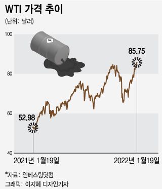18일(현지시각) 미국 뉴욕상업거래소에서 서부텍사스원유(WTI) 3월물은 1.11% 오른 85.7달러를 기록했다. 2014년 10월 이후 가장 높은 수준이다. 또 영국 런던ICE선물거래소에서 브렌트유 3월물은 배럴당 1.03% 오른 88.41달러를 찍었다.
