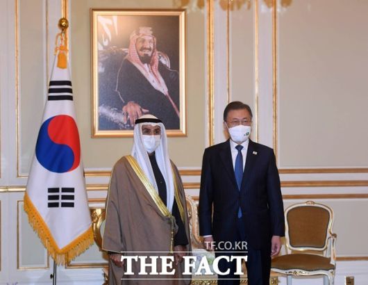 [더팩트ㅣ허주열 기자] 사우디아라비아를 공식 방문 중인 문재인 대통령은 19일 오전(현지시간) 나예프 알 하즈라프 걸프협력회의(GCC) 사무총장을 접견하고, 우리나라와 GCC 간 협력 강화 방안 등에 대한 의견을 교환했다.