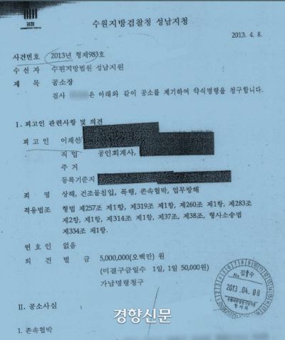 수원지방검찰청 성남지원이 2013년 4월 이재명 더불어민주당 대선 후보 셋째 형 재선씨를 존속협박 등의 혐의로 약식명령을 청구한 공소장. 민주당 선대위 제공 |