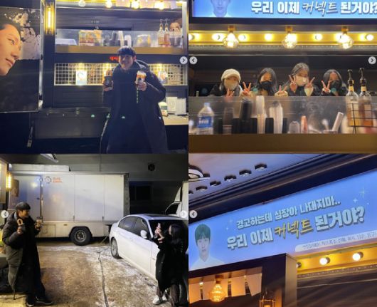 공개된 사진 속 정해인은 커피와 츄러스를 들고 커피차 앞에서 밝게 미소를 짓고 있다. 이런 정해인의 사진을 지수가 허리까지 숙인 채 찍어주고 있는 모습도 담겨 웃음을 자아낸다.