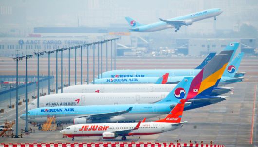 지난 18일 인천국제공항 주기장에 제주항공, 대한항공, 아시아나항공 등의 비행기가 집결해있다. 연합뉴스 |
