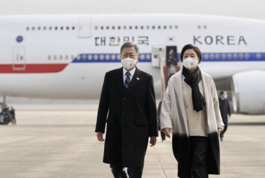 [성남=뉴시스 김진아 기자 = 아랍에미리트(UAE), 사우디아라비아, 이집트 등 중동 3개국 순방을 마친 문재인 대통령과 부인 김정숙 여사가 22일 경기 서울공항에 도착해 공군 1호기에서 내려 이동하고 있다. 2022.01.22. |