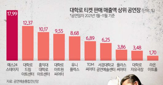 공연예술통합전산망에 따르면 대학로 지역에는 총 163개 공연시설이 존재하며 공연장 수는 총 209개에 달한다. 이 가운데 티켓 판매 매출액 기준으로는 지난해 1월부터 11월 티켓 매출자료를 기준으로 총 3개의 공연장이 가동되는 예스24스테이지가 전체의 17.99%를 기록하며 1등을 차지한다. 다음은 역시 공연장 4개를 가진 대학로 드림아트센터가 12.37%이며 홍익대 대학로아트센터가 10.17%, 대학로 아트윈씨어터가 9.55%, 유니플렉스가 8.68%, TOM씨어터가 6.89% 등이다.