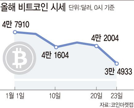 가상자산(암호화폐) 시가총액 1위인 비트코인을 비롯해 코인 시장이 하락세다. 미국의 금리 인상 전망과 기술주 하락세에 러시아의 비트코인 채굴·거래 금지 가능성까지 맞물린 여파다. 코인을 위험자산으로 인식해 투자 심리가 위축되고 있어 당분간 반등이 쉽지 않을 전망이다.