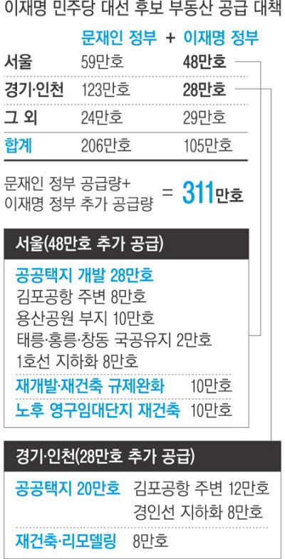 이재명 더불어민주당 대선 후보가 23일 서울 48만호 등 전국적으로 105만호를 추가로 짓는 주택공급 대책을 발표했다. 문재인 정부의 기존 계획과 더해 총 311만호를 공급할 계획이다. 지난해 8월 경선에서 밝힌 250만호보다 61만호 늘어난 것이다. 또 생애최초 주택 구입자의 주택담보인정비율(LTV)도 최대 90%까지 늘리는 등 금융 규제도 대폭 완화하겠다고 했다.