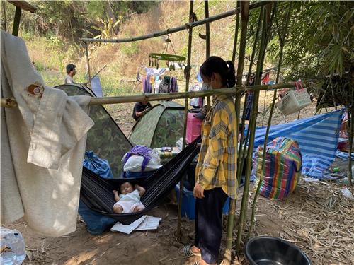 카렌족 난민 캠프에서 젖먹이를 흔들어 재우는 한 여성 2022.1.16 |