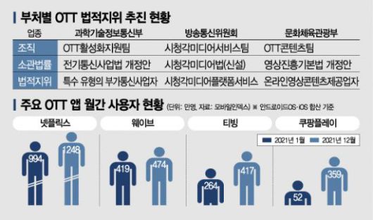 국내 OTT 업체 콘텐츠웨이브, 티빙 등은 적자를 벗어나지 못하고 있다. 정부는 국내 OTT들의 자생력을 키워야 한다는 데 공감하고 있지만 지원책 마련 속도는 더디다. 2020년 6월 범정부 차원에서 발표한 ‘디지털 미디어 생태계 발전방안’이 대표적이다. 범정부 조직 출범 이후 부처 간 이견 속에서 법적지위 부여를 포함해 실효성 있는 세제 지원 방책이 나오지 못하고 각종 법안들도 2년 6개월째 표류하고 있다.