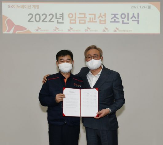 SK이노베이션 노사는 지난 13일 임금교섭 상견례 자리에서 곧바로 잠정합의안을 도출했다. 20일 조합원 대상 찬반투표에서 참여 조합원 87.3%의 찬성으로 2022년 임금협상을 타결시켰다. 노사는 임금인상률을 전년도 소비자물가지수(한국은행 발표)에 연동하기로 합의했다. 이에 따라 지난해 소비자물가지수 상승률인 2.5%로 확정됐다.