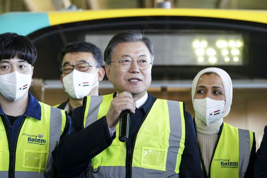 문재인 대통령이 21일(현지 시각) 이집트 카이로 엘살렘 차량기를 방문해 현대로템이 공급한 전동차량 앞에서 방문 소감을 밝히고 있다./청와대 페이스북 |
