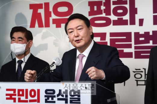 윤 후보는 이날 서울 여의도 당사에서 대북·외교·국방정책 등 총 20개의 외교안보 공약을 발표했다. 그는 북한 비핵화 로드맵에 대해 “북한이 완전하고 검증 가능한 비핵화에 적극적으로 나서면 남북한 평화협정을 준비하고 전폭적인 경제 지원과 협력을 실시하겠다”고 밝혔다. 완전한 비핵화 이전이라도 북한이 실질적 비핵화 조치를 취할 시 유엔 제재 면제 등을 활용해 대북 경제지원을 하겠다고 했다. 다만 남북 정상회담에 대해선 “국내 정치에 외교를 이용하고 남북 통일을 이용하는 건 쇼다. 저는 쇼는 안 한다”고 말했다.