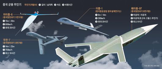 중국이 군사용 무인기 개발과 생산에 박차를 가하고 있다. 무인기의 창과 방패 역할을 하는 무인기용 미사일, 적 무인기에 대한 요격 기술 연구도 진행 중이다. 중국은 무인기를 아직 공격 임무에 투입한 적은 없다. 하지만 각국에 수출된 무인기를 통해 실전 경험도 쌓고 있다. 한반도 주변 해역은 물론 미·중 갈등이 커지는 남중국해 등에서 정찰·공격 능력이 강화될 전망이다.