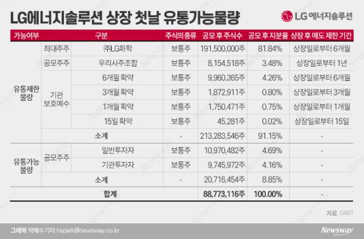 LG에너지솔루션은 최대주주 LG화학이 지분 81.84%(1억9150만주)에 대해 6개월 보호예수를 걸면서 애초에 유통가능물량이 많지 않았다. 여기에 수요예측에 참여한 기관투자자들의 절반 이상이 최소 15일, 최대 6개월의 의무보유확약을 걸면서 전체의 91.15%가 유통제한물량으로 잡히게 됐다.