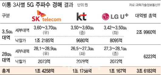 2018년 5G주파수 경매 결과. SK텔레콤은 이번에 정부에 3.7GHz~4GHz 중 300MHz 폭에서 당장 사용가능한 40MHz을 추가 할당해 달라고 요청하는 승부수를 띄웠다. |