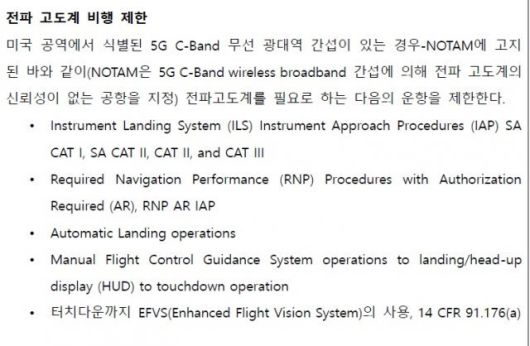 미국 보잉과 유럽 에어버스 등 항공기 제작사들과 미국 항공 당국은 국내 항공사들도 운용하고 있는 기종인 A320, A330, B777, B748i 등이 5G로 인한 RA 간섭의 우려가 있다고 보았습니다만, 최근에는 공항 인근 5G 서비스 연기 및 제작사들의 대체 수행방법(AMOC, Alternative Method of Compliance) 신청 등을 통해 보잉과 에어버스가 제작한 항공기의 약 80%에 대한 비행 허가를 한 상태입니다. 5G 논쟁이 한창일 땐 대한항공과 아시아나항공도 5G 문제로 인해 공항 접근이 제한된 항공기를 안전이 확보된 항공기로 대체 운행하기도 했죠. 대한항공과 아시아나항공 등은 내부 공지를 통해 5G 간섭으로 인한 문제 발생 가능성과 이에 대한 대응절차 및 주의사항을 승무원들에게 공지한 상태입니다.