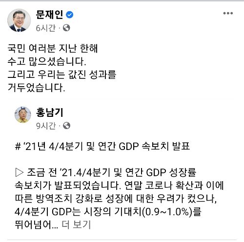 지난해 6월 문 대통령은 홍 부총리가 한국은행의 1분기 성장률 잠정치 발표에 대한 분석글을 올리자, 이를 자신의 SNS에 공유하면서 "빠른 경기회복을 알려주는 좋은 소식"이라고 했다.