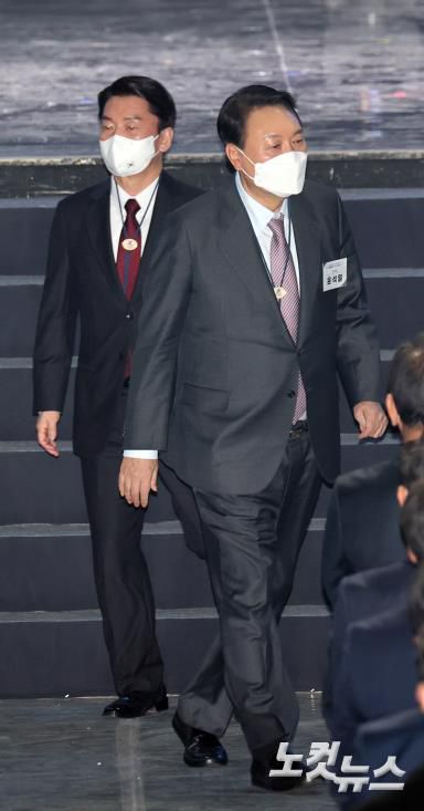 윤석열 국민의힘 대선후보(오른쪽)와 안철수 국민의당 대선후보가 25일 오후 서울 송파구 올림픽홀에서 열린 2022 제24회 베이징 동계올림픽 선수단 결단식에 참석해 기념촬영을 마친 뒤 무대를 내려가고 있다.저작권자 © CBS 노컷뉴스 무단전재 및 재배포 금지