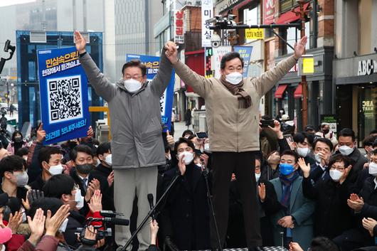 이재명 더불어민주당 대선 후보와 이낙연 전 대표가 경기 성남에 이어 의정부에서 이틀 연속으로 공동 선거운동에 나서며 '원팀' 행보를 이어갔다.