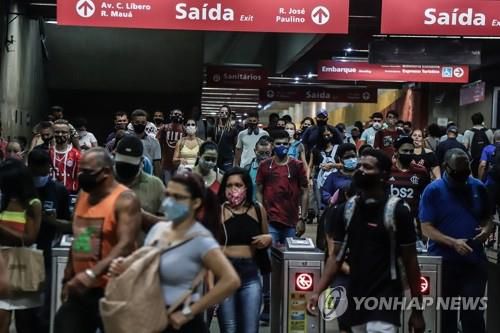 마스크 쓴 시민들로 붐비는 상파울루 지하철역 |