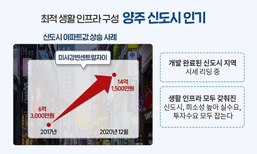 KB국민은행 리브부동산 시세자료에 따르면, 이 지역 대장주 아파트로 꼽히는 ‘미사강변센트럴자이’ 전용 96㎡A타입의 평균매매가는 지난해 12월 기준 14억1500만원으로, 입주초기인 2017년 1월 6억3000만원과 비교해 보면 5년도 채 되지 않아 시세가 2배가 넘었다.