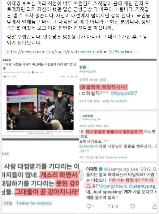 이재명 더불어민주당 대선후보가 “국민 개돼지 취급하는 사람에 나라 맡기면 안 된다”는 발언을 한 후 그의 과거 소셜미디어(SNS) 글이 인터넷에 재공유 되고 있다.