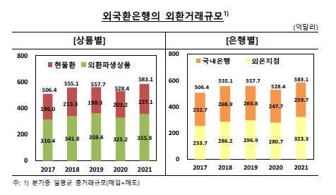 은행별로는 국내은행의 거래규모가 259억7000만 달러로 전년 대비 12억달러(4.9%) 늘었다. 외은지점의 거래규모는 323억3000만달러로 전년 대비 42억6000만 달러(15.2%) 증가했다.