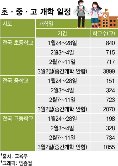 중간개학 없이 3월2일에 개학하는 학교가 7024개(59.7%)로 가장 많지만 40%에 이르는 학교가 2월11일 이전에 개학한다는 점에서 학교 내 방역도 무시할 수 없는 변수다. 개학 후 학생 확진자가 늘어날 경우 학부모 등을 중심으로 정상등교에 반발하는 목소리가 나올 가능성을 배제할 수 없다.