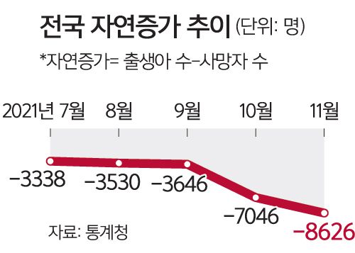 인구 고령화의 영향으로 지난해 11월 사망자 수는 2만8426명으로 전년보다 11.0%(2823명) 증가했다. 사망자 수 역시 1983년 관련 통계 작성 이래 동월 기준 가장 많았다. 이에 따라 11월 인구 자연증가분(출생아-사망자)은 ?8626명으로 나타났다. 사망자 수가 출생아 수를 웃돌면서 외부 유입 인구 등을 제외한 국내 인구는 8000명 넘게 자연적으로 감소했다는 의미다. 이로써 국내 인구는 2019년 11월부터 25개월 연속 자연감소를 기록했다.