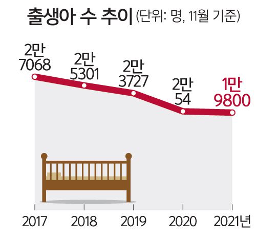 이로써 월별 출생아 수는 2015년 12월부터 72개월째 전년 동월 대비 감소세를 이어갔다. 11월 출생아 수가 역대 최저치를 기록하면서 지난해 1~11월 누계 출생아 수는 24만4016명에 그쳐 전년 동기(25만2696명) 대비 3.4% 감소했다. 이에 따라 연간 출생아 수는 2020년에 이어 2년 연속 20만명대를 기록할 전망이다.