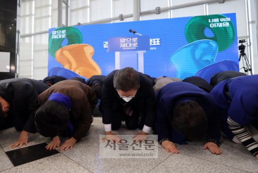 이재명 더불어민주당 대선후보가 24일 경기 용인 포은아트홀에서 정책 공약 발표에 앞서 경기도에 지역구를 둔 민주당 의원들과 함께 반성의 의미를 담은 큰절을 하고 있다. 김명국 선임기자 |
