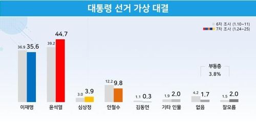 리얼미터가 YTN 의뢰로 24∼25일 전국 만 18세 이상 남녀 1천18명을 대상으로 대선 후보 지지율을 조사한 결과 윤 후보는 직전 조사(10∼11일)보다 5.5%포인트 오른 44.7%였다.
