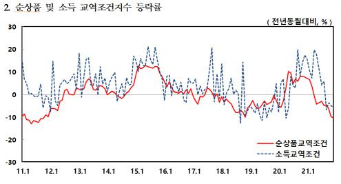 최진만 한은 경제통계국 물가통계팀 팀장은 “순상품교역지수가 9개월 연속 하락한 것은 국제 유가 상승이 가장 큰 원인이며 2020년의 기저효과도 작용한 것으로 보인다”면서 “최근까지 유가 수준을 보면 80달러를 넘어 오르는 추세고 원자재 가격도 상승하는 흐름이 이어지고 있다”고 설명했다.