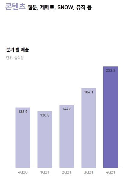 메타버스 플랫폼 '제페토' 활성화로 인한 스노우 성장도 기대감을 키운다. 스노우 카메라 구독 모델을 추가하고 제페토 생태계가 활성화되면서 스노우 매출은 전년동기대비 174% 성장했다. 박 CFO는 '콘텐츠 매출은 웹툰과 스노우, 브이라이브, 뮤직으로 구성되는데 브이라이브와 뮤직은 전년대비 큰 차이 없지만 웹툰과 스노우에서 매출 성장이 눈에 띄게 증가했다'고 말했다.
