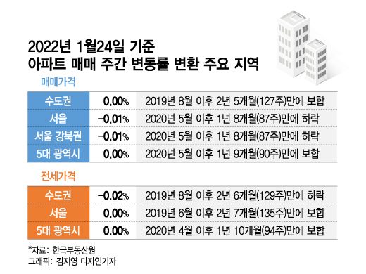 27일 한국부동산원에 따르면 지난 24일 기준 서울 아파트값 변동률이 -0.01%를 기록해 1년8개월 만에 하락전환했다. 작년 추석 명절을 기점으로 상승폭이 4개월째 위축되다 기준금리 인상, 대출규제 강화 등이 이어지면서 결국 마이너스를 기록했다.
