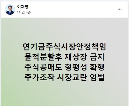 이 후보는 이날 오후 SNS에 “연기금 주식시장 안정 책임, 물적분할 후 재상장 금지, 주식공매도 형평성 확행, 주가조작 시장교란 엄벌” 등 내용을 적었다.