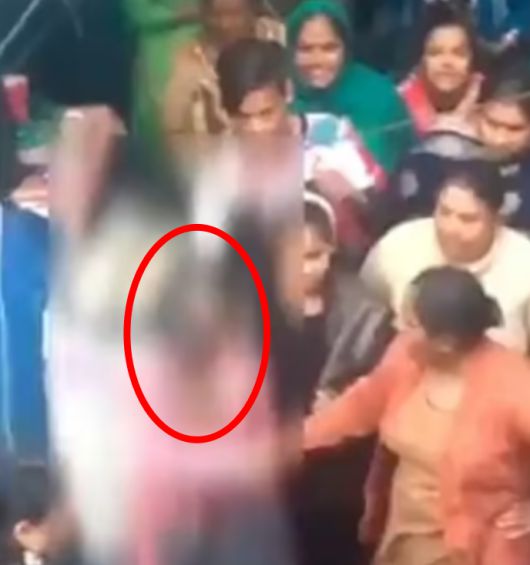 옷 일부가 찢어져 있었으며, 목에는 신발이 엮인 줄이 걸려있었다. 이 여성은 다른 여성 등에 의해 밀쳐지고 끌려다니며 거리를 걸었다.