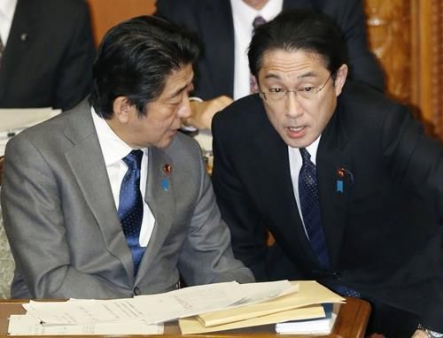 2015년 1월 28일 일본 참의원 본회의에서 아베 신조 당시 일본 총리와 기시다 후미오 당시 외무상이 대화하고 있다. 교도 연합뉴스 자료사진. |