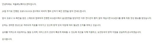 소속사 측은 "코로나19 확진을 받은 스태프와 접촉하여 진행한 PCR 검사에서 음성판정을 받았지만 이후 컨디션이 좋지 않아 재실시한 PCR 검사를 통해 최종 양성 통보를 받았다"고 밝혔다.