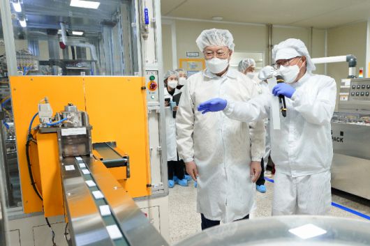 문재인 대통령이 SD바이오센서를 방문해 신속항원검사키트생산공정 등을 살펴보고 있다. 연합뉴스