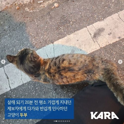 카라 측은 “범인 행위로 볼 때 한두 번 해본 게 아닌 듯 매우 익숙하게 고양이를 바닥에 내리쳤다”며 “목격자가 ‘뭐하냐’고 소리치니 고양이 사체를 바닥에 버리고 유유히 사라졌다”고 밝혔다.