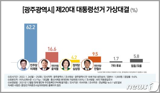 여론조사전문기관인 리서치뷰가 뉴스1, 전남매일, 남도일보 의뢰로 지난 24∼25일 광주지역 유권자 1000명을 대상으로 실시한 여론조사에서 대선 가상대결 지지도는 더불어민주당 이재명 후보 62.2%, 국민의힘 윤석열 후보 16.6%로 나타났다. 이어 국민의당 안철수 후보 9.5%, 정의당 심상정 후보 4.2%였다.