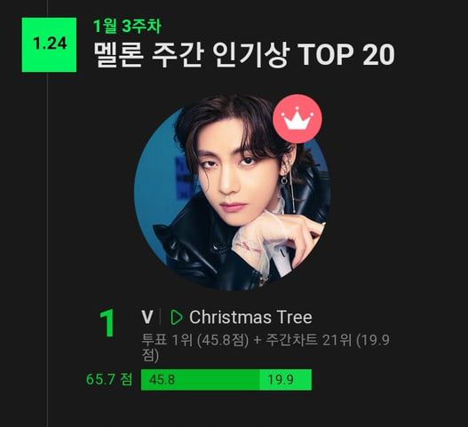 방탄소년단 뷔가 ‘Christmas Tree’로 멜론 주간 인기상 1위를 차지했다.
