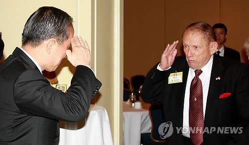 제42차 한미안보협의회(SCM) 참석을 위해 미국을 방문한 김태영 전 국방장관이 2010년 10월8일(워싱턴 시간) 워싱턴 펜타곤 인근 한 호텔에서 역대 주한 미군사령관과 한국전 참전 미군 지휘관들을 초청한 가운데 열린 리셉션에서 한국전에 참전했던 전 주한미군 참모장 존 싱글러브 장군에 거수경례를 하며 예를 표하고 있다. [연합뉴스 자료사진] |