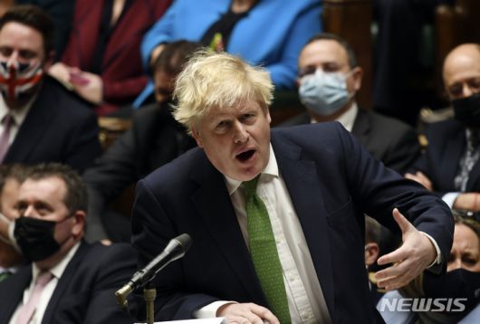 [런던=AP/뉴시스] 보리스 존슨 영국 총리가 19일(현지시간) 런던 하원에서 열린 총리 질의 시간에 발언하고 있다. 존슨 총리는 '코로나19 봉쇄 중 파티 참석' 논란으로 의회에서 사임 요구를 받았으나 이를 거부했다. 2022.01.20. |