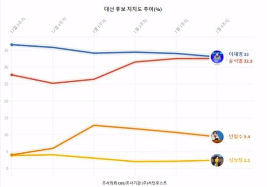 여론조사 전문업체 서던포스트가 CBS 의뢰로 지난달 28일~29일 이틀간 전국 만 18세 이상 남녀 1002명을 대상으로 전화 면접조사(무선 100%)를 실시한 결과, 이재명 후보 지지율은 33.0%, 윤석열 후보의 지지율은 32.5%로 집계됐습니다. 사실상 양 후보는 동률(격차0.5%p)로 접전을 벌이고 있죠.