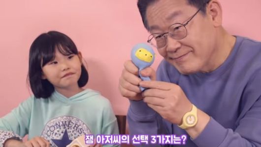 보라색 스웨트셔츠를 입고 등장한 이 후보는 이날 영상에서 자신을 ‘잼 아저씨’라고 소개하며 “초등학교 때 놀아본 적이 오래됐다”고 했다. 이 후보와 라임양은 노래 부르기를 걸고 초등학생 사이에서 유행하는 ‘팝잇 누르기 대결’을 펼쳤다. 팝잇은 ‘뽁뽁이’이라 불리는 완충재를 실리콘으로 만든 손 장난감으로 ‘푸시팝’이라고도 불린다.