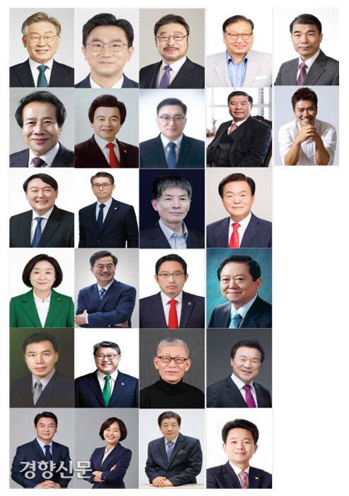 선관위 홈페이지에서 예비후보자 명부를 찾으면 이재명·윤석열·심상정·안철수 후보의 이름을 찾아볼 수 있다. 민주당 대표를 했던 손학규 무소속 후보나 문재인 정부에서 부총리 겸 기획재정부 장관을 했던 김동연 새로운물결 후보도 익숙한 이름이다. ‘친박’ 조원진 우리공화당 후보, ‘허본좌’라 불리는 국가혁명당 허경영 후보도 눈에 띈다. 이외 오승철 국민의힘, 강성현 국민의당, 오준호 기본소득당, 고영일 국민혁명당, 김재연 진보당, 김민찬 한류연합당, 황장수 혁명21, 김기천·최대집·양성기·이원식·김성광·김유찬·김경재·이건개·이재원·김대한·이백윤 무소속 후보가 예비후보자로 등재돼 있다. 손학규 후보는 지난 27일 사퇴의 뜻을 밝혔다. 이로써 대선 예비후보는 총 25명이 됐으나, 아직 중앙선관위 홈페이지에는 반영되지 않았다.