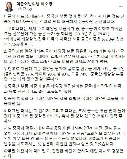 이에 이소영 민주당 선거대책위원회 대변인은 이날 본인 페이스북에서 “(이준석) 대표님이 중국산 부품 많이 들어간 전기차 타는 것도 친중이냐”며 “이런 식으로 팩트 왜곡해서 선동하면 곤란하다”고 반발했다.
